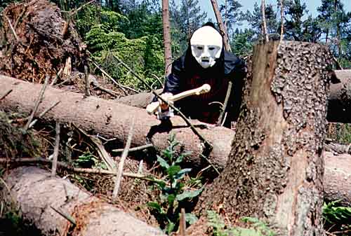 So gingen wir anderen also frohen Mutes auf die Suche. Schon nach kurzer Zeit stießen wir auf den Kampfplatz, auf dem Lugh von Kyralast tödlich verwundet worden war. Ein alter Mann auf der anderen Seite des Platzes bedeutete uns diesen nicht zu betreten. Nachdem wir uns durch das Unterholz durchgekämpft hatten, erklärte er uns, daß er der ehemalige Diener des Lugh sei und berichtete folgendes von dem Kampf: